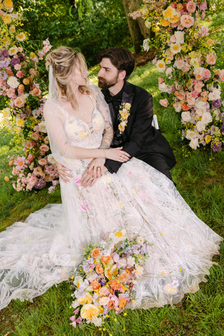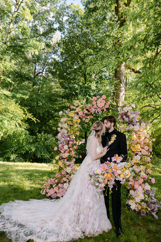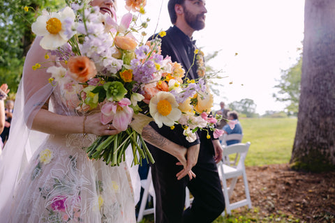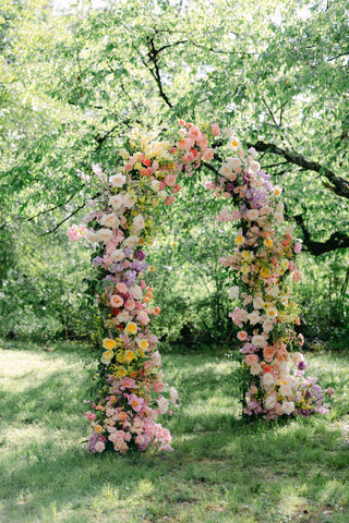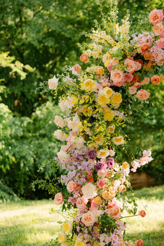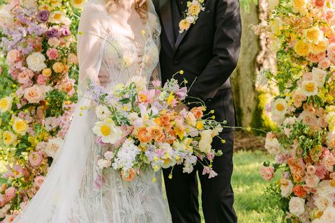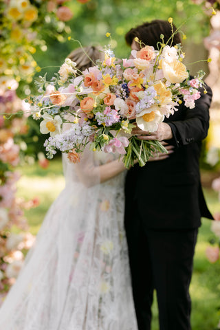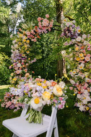 With a focus on bold color, lush texture, and an incredible variety of blooms, Tessa and Josh said “I do” beneath a color-blocked arbor—an unforgettable statement piece that we can’t stop dreaming of. Tessa’s bouquet, our largest bridal bouquet to date, was a masterpiece in itself! Overflowing with hellebore, lily of the valley, daffodils, tulips, Claire de Lune peonies, muscari, and so much more, it couldn’t have been more perfect for Tessa!