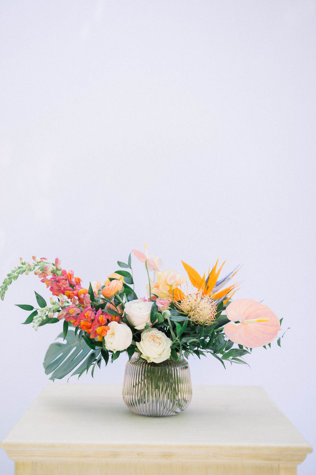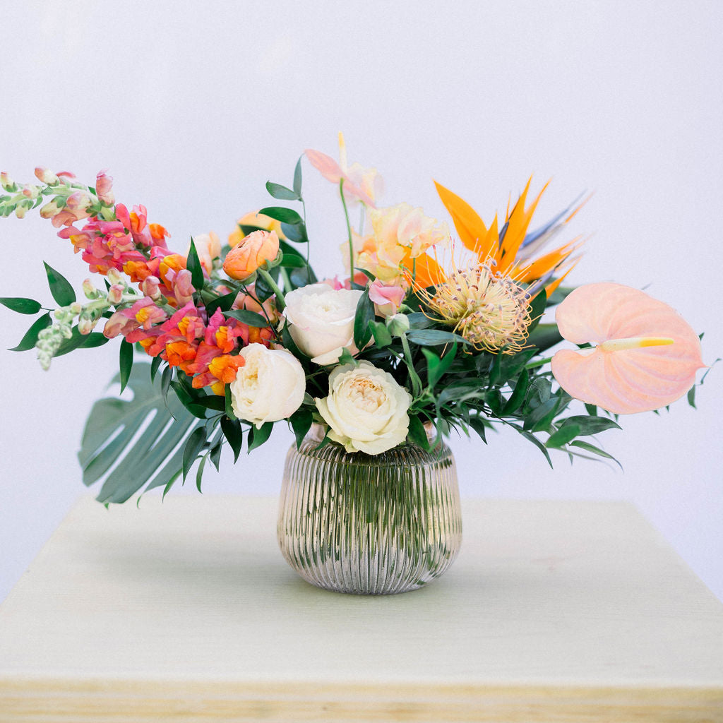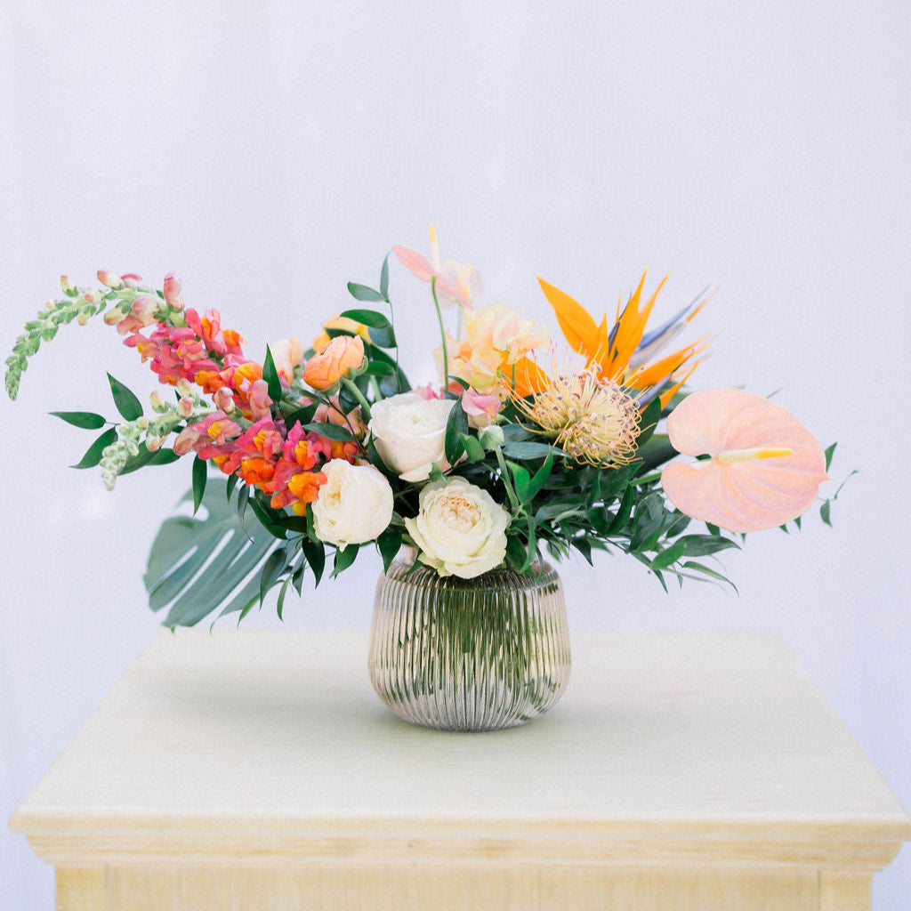 Travel to the tropics with this fresh arrangement to include splashes of bright, colorful, blooms and tropical foliage.