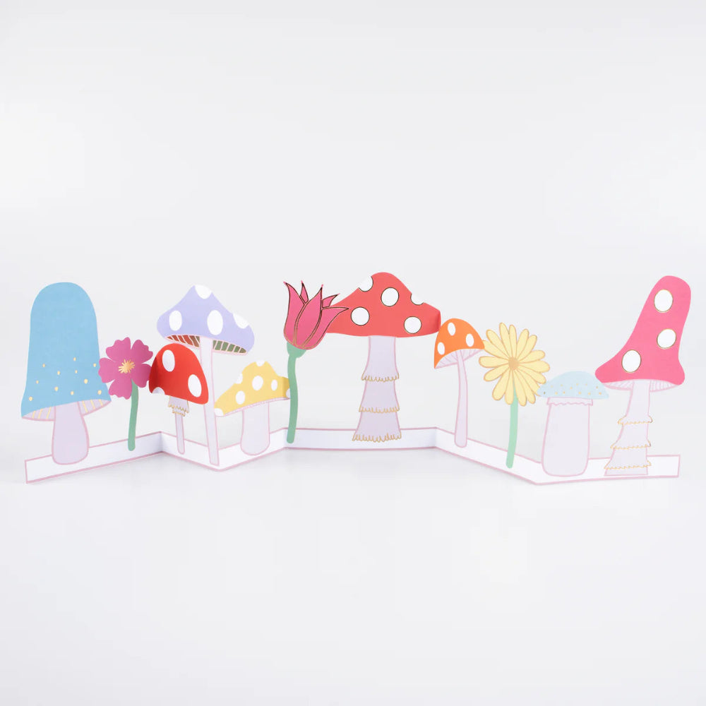 This card puts the fun in funghi! Featuring an on-trend mushroom motif, this card folds out as a concertina shape, which will look fabulous on a mantel or on the birthday party table!